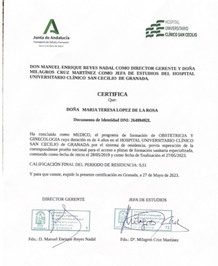 Especialidad en Obstetricia y Ginecología en Hospital Universitario San Cecilio en Granada.