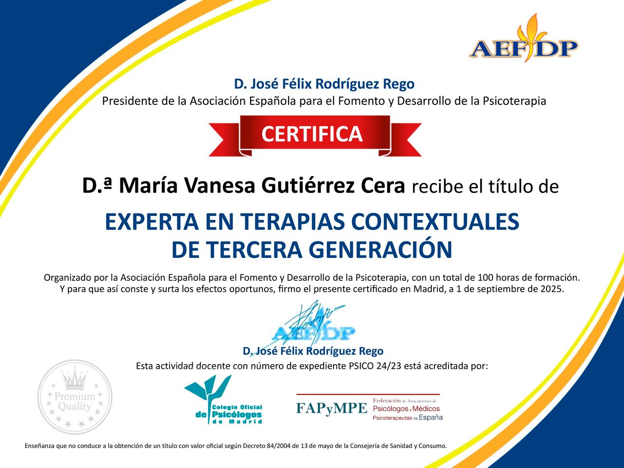 ¡Hola! Soy Vanesa Gutiérrez, Psicóloga General Sanitaria, con formación en terapia sistémica y en terapias de tercera generación. Durante estos últimos años he trabajado tanto individual como grupalmente, abordando dificultades familiares, de pareja e individuales.