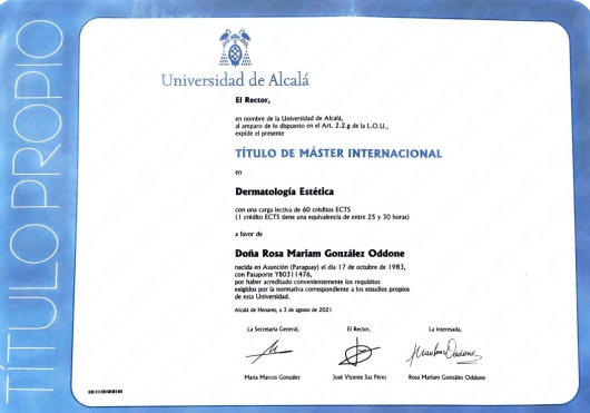 Aquí realicé el Máster en Dermatología Estética en la Universidad de Alcalá de Henares de Madrid, bajo la dirección del prestigioso Prof. Dr. Pedro Jaén y su equipo. También me formé en Tricología, realizando una Diplomatura, bajo el aval del Colegio Iberolatinoamericano de Dermatología, área en la que profundizo el cuidado médico y estético del cabello.
