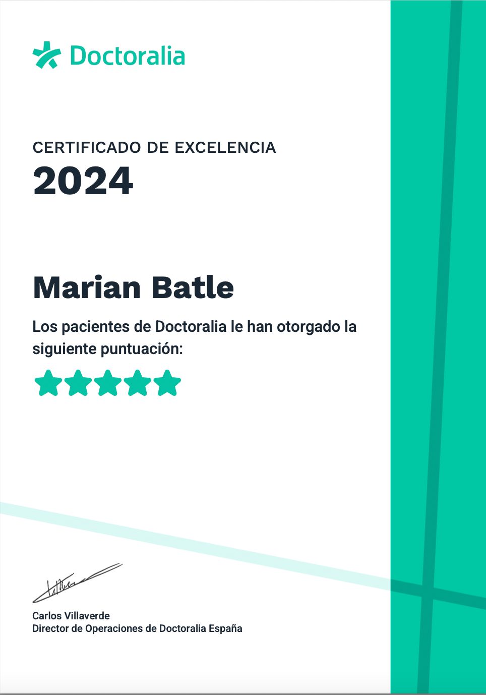 ¿Qué opinan los pacientes de Marian Batle?Un total de 134 pacientes han querido dejar una opinión sincera y real sobre Marian Batle, otorgándole además una valoración media de 5 estrellas (sobre un máximo de 5).