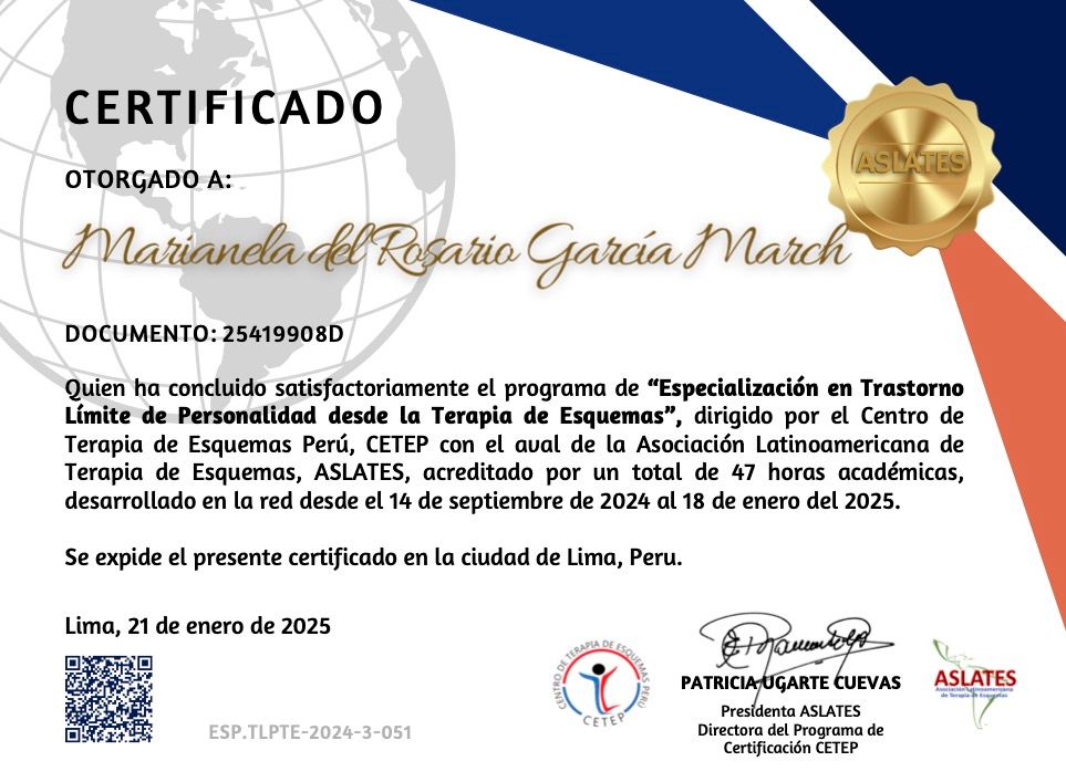 ¿Cuáles son las principales especialidades de Marianela García March?Marianela García March es psicóloga, psicóloga infantil, terapeuta complementaria. Te mostramos algunos de los servicios que ofrece gracias a su trayectoria y amplia experiencia: Primera visita Psicología, Arteterapia, Diagnóstico y tratamiento de los trastornos depresivos, Modificación del estilo de vida, Técnicas y estrategias de autoestima, Terapia cognitivo-conductual, Tratamiento para trastornos infanto-juveniles, Psicología adultos, Diagnóstico y tratamiento para trastornos de ansiedad, Coaching psicológico.