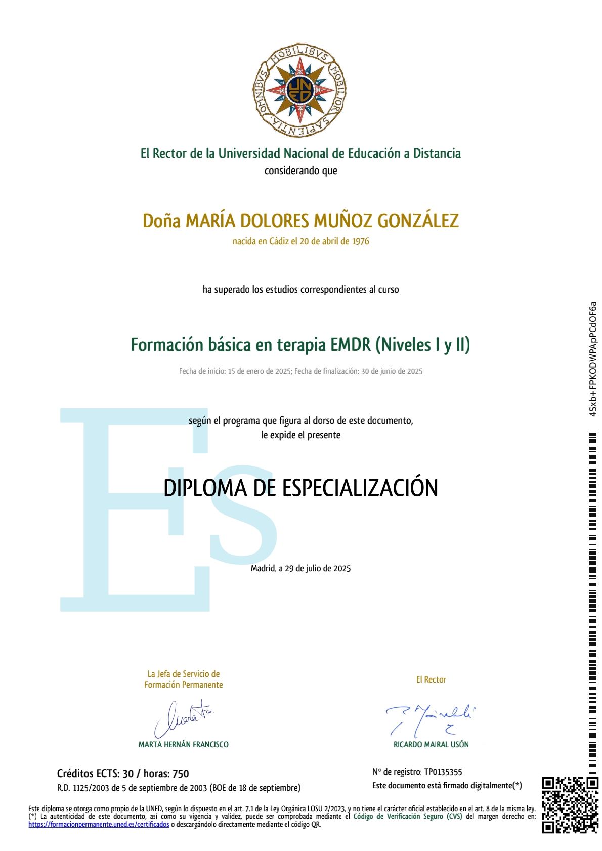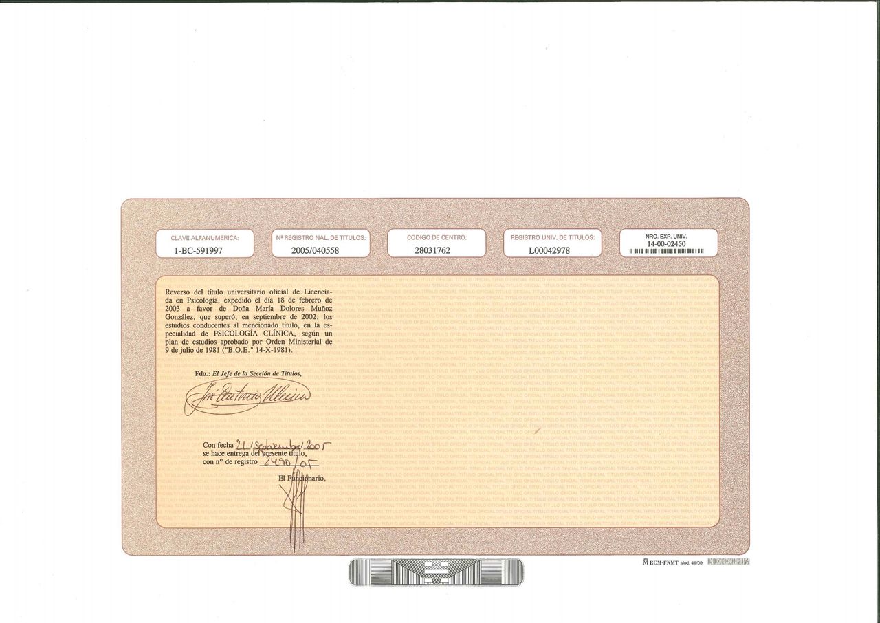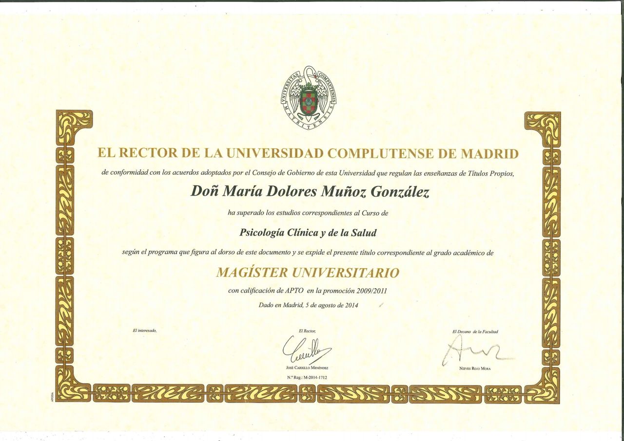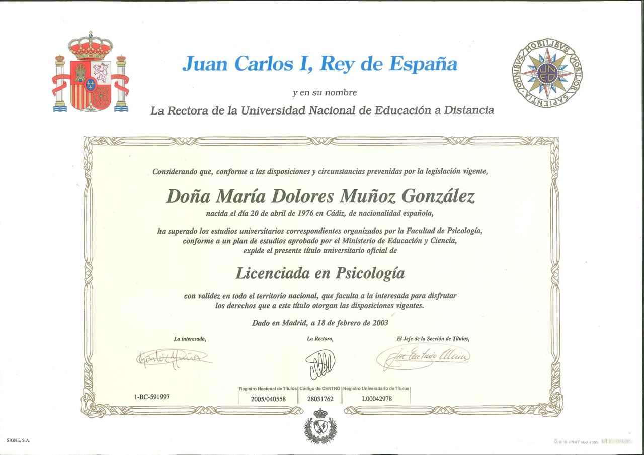 Tras varios años de experiencia, decido completar mi formación matriculándome en el Máster de Psicología Clínica y de la Salud. Al finalizar dicho máster, me dispongo a abrir mi propio gabinete para abordar y ampliar otras áreas centradas en la Evaluación, Diagnóstico y Tratamiento psicológicos. Actualmente cuento con consulta de psicología en Cádiz.