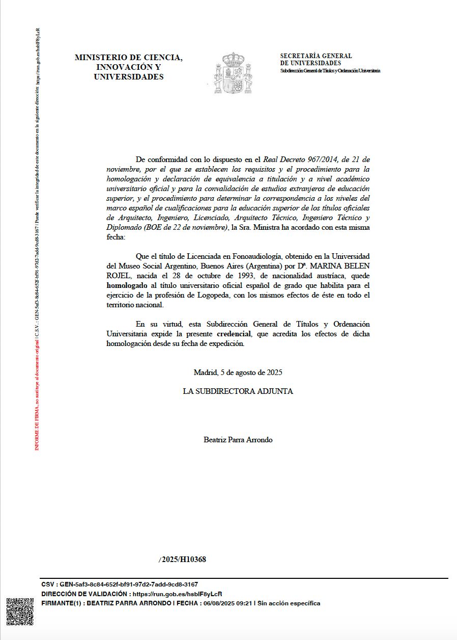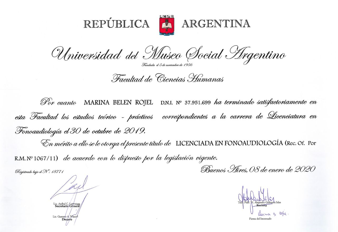 Licenciada en Fonoaudiología por la UMSA (Universidad del Museo Social Argentino), homologada a Logopeda en España.