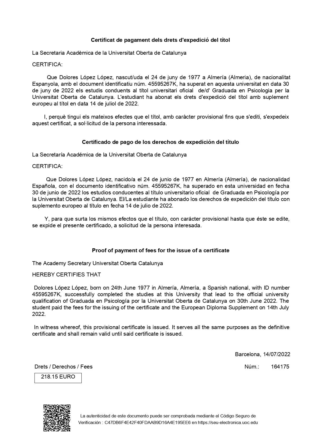 Me licencié en Psicología por la Universitat Oberta de Catalunya (UOC) y, posteriormente, realicé el Máster en Psicología General Sanitaria en la Universidad Europea, lo que me permite ejercer como psicóloga sanitaria. Mi especialización está centrada en la gestión de adicciones, tanto a nuevas tecnologías como a sustancias, gracias a mi formación como Experta Universitaria en Adicciones y Drogodependencia por la Universidad Internacional de La Rioja (UNIR). Además, he complementado mi formación con diversos cursos, como la Terapia basada en la Inteligencia Emocional y el Tratamiento de la Agorafobia y la Crisis de Angustia, ambos impartidos por el Colegio Oficial de Psicología de Cataluña (COPC), lo que me permite ofrecer un enfoque integral en el tratamiento de trastornos emocionales y de ansiedad.