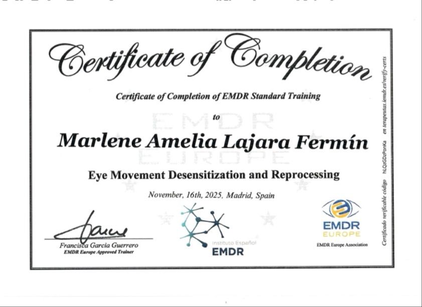 Estoy certificada en EMDR por EMDR Europe, el Instituto Español de EMDR y la Asociación EMDR España, lo que me permite abordar experiencias difíciles y trauma desde un marco clínico sólido y reconocido a nivel europeo.