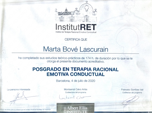 He realizado un Posgrado en Terapia Racional Emotivo – Conductual del Albert Ellis Institute (2019-2020).