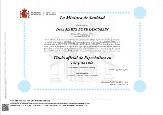 Me he especializado en Psiquiatría en el Hospital Vall d'Hebrón de Barcelona entre 2015 y 2019.
