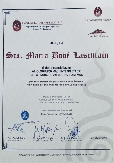 Cuento con el título de Especialista en Axiología Formal e Interpretación de la Prueba de Valores R.S. Hartman por el Departamento de Axiología Cognitiva Robert S.Hartman (2023).