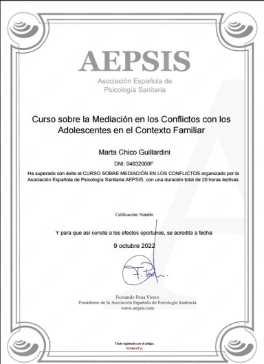 Hemos estado con Marta durante 10 meses desde que nos derivaron a ella y la evolución de nuestro hijo ha sido súper positiva. Nos ha ayudado, acompañado y se ha implicado muchísimo con nosotros. Es una excelente profesional, que muestra empatía y nos ha dotado de muchísimos recursos para mejorar también a nivel familiar. Ha sido una ayuda clave en nuestro proceso. Infinitamente agradecidos.