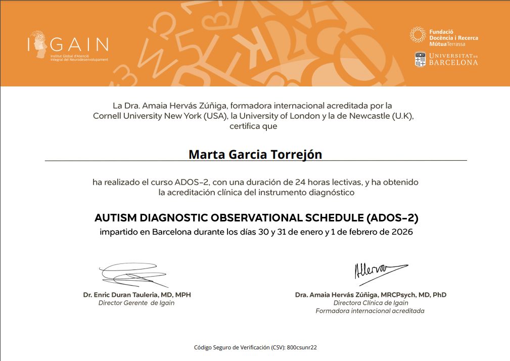 M’he especialitzat en l’avaluació i intervenció en trastorns del neurodesenvolupament, TDAH, dificultats d'aprenentatge, trastorns emocionals i de conducta, i en orientació familiar. Estic acreditada per a l’ús d’eines diagnòstiques, i continuo formant-me en noves metodologies d’avaluació i intervenció infantil.