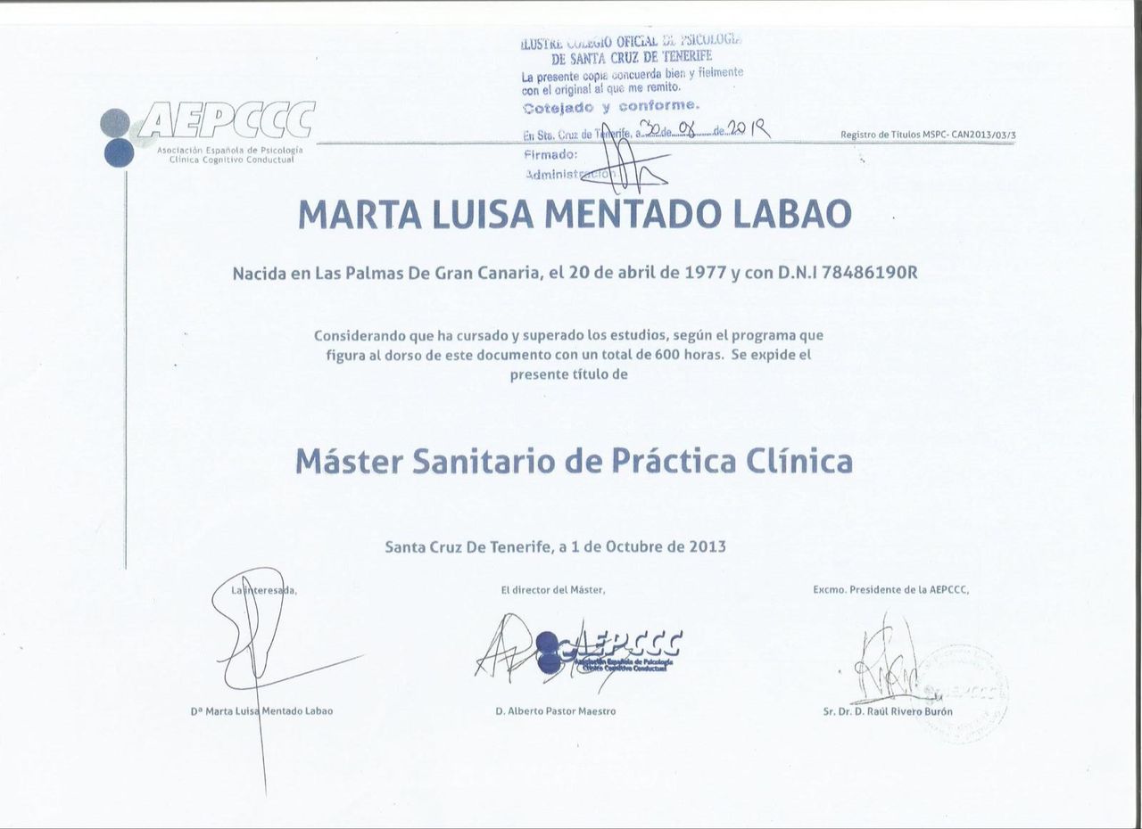 Soy Marta Mentado y ejerzo la psicología en Santa Cruz de Tenerife desde hace más de diez años. Me apasionó la psicología desde el primer momento en que entré en contacto con ella. Ayudar ha sido siempre mi deseo y qué mejor manera que a través de las herramientas de la psicología. Gestionar el malestar, la incertidumbre, la inseguridad, el miedo… y conseguir el bienestar, son algunos de mis objetivos.