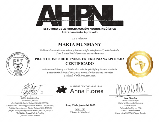 ¿Cuáles son las principales especialidades de Marta Munmany?Marta Munmany es terapeuta complementaria. Te mostramos algunos de los servicios que ofrece gracias a su trayectoria y amplia experiencia: Hipnosis Ericksoniana, Coaching individual.