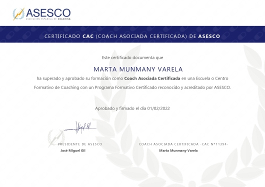 Mi nombre es Marta Munmany Varela, soy Coach certificada por ASESCO® nº11394 e Hipnoterapeuta Ericksoniana y mi trabajo consiste en acompañar a mis clientes en la búsqueda de su felicidad y autorrealización