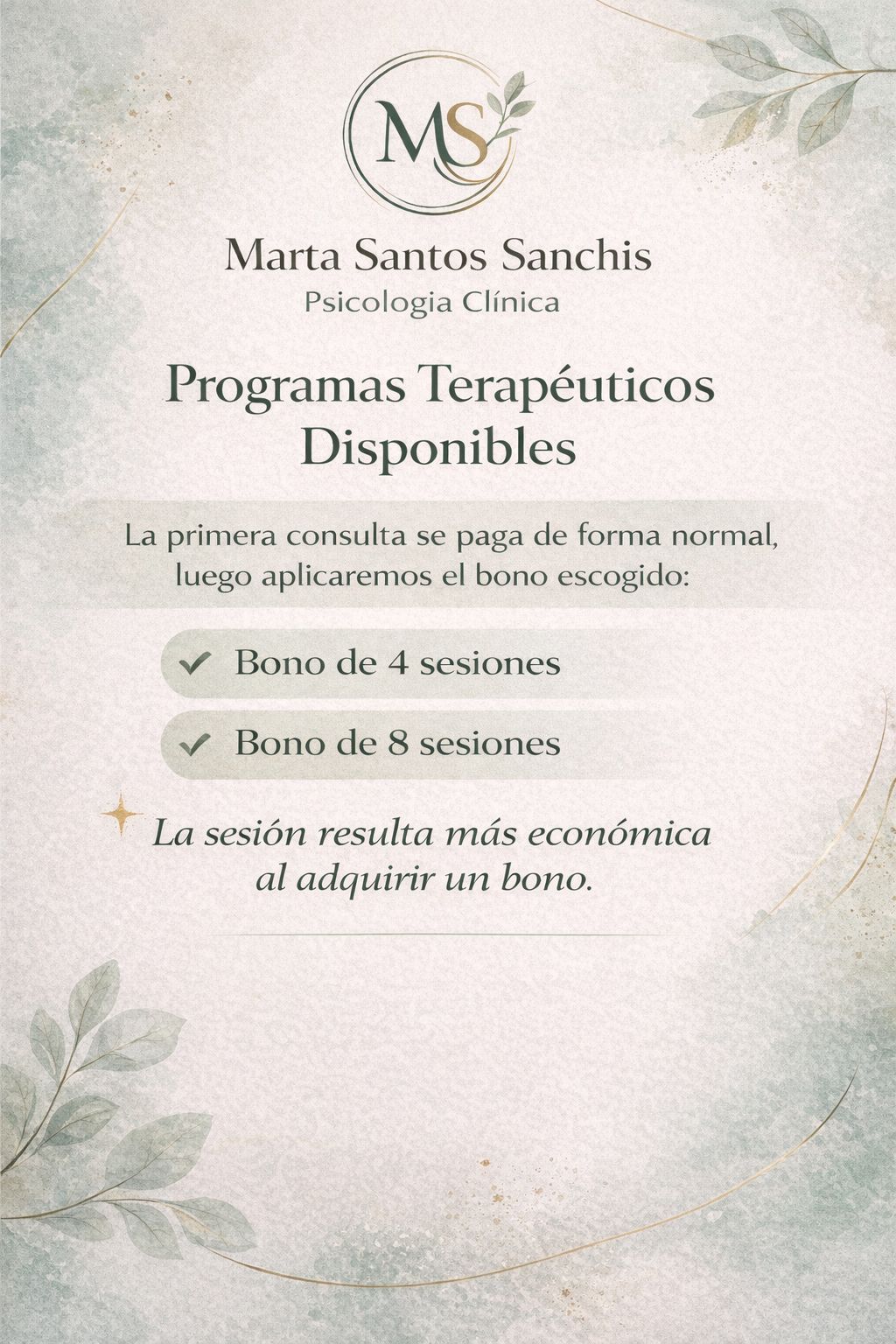 La primera consulta se realiza de forma individual y después podrás beneficiarte de sesiones más económicas con bono.