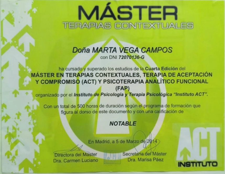 Podría escribir horas a cerca de su increíble trabajo. Estoy muy agradecida y sin lugar a duda la recomendaría a todo el mundo.• Marta Vega Campos Centro de Psicología Contextual • Terapias contextuales/ de tercera generación •