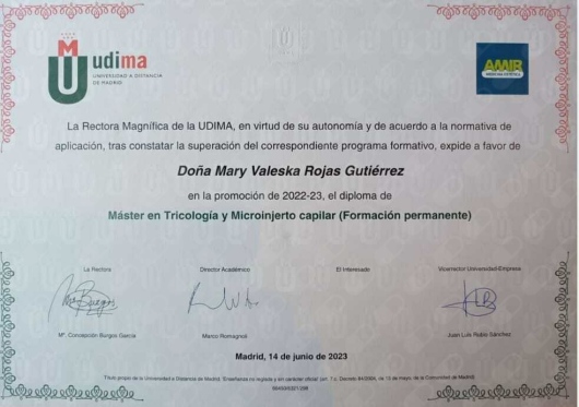 Realizó un Postgrado en Medicina Estética en AVICENA de Argentina y posee un Máster en Tricología y Microinjerto Capilar en la UDIMA de España. Es experta Universitaria en Nutrición y Dietética por la UNIR (España).