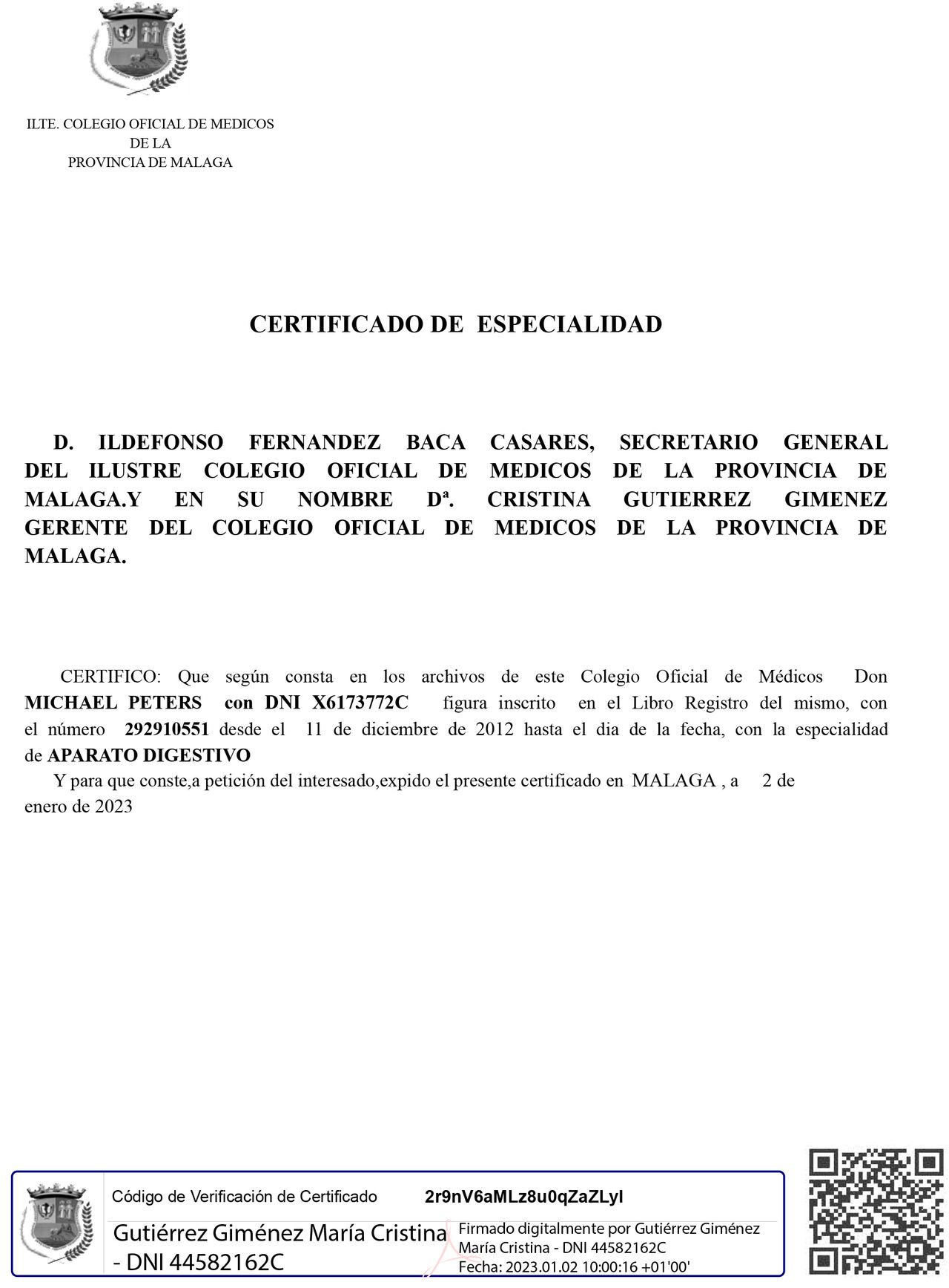 ¿Cuáles son las principales especialidades de Michael Peters?Michael Peters es digestólogo, internista. Te mostramos algunos de los servicios que ofrece gracias a su trayectoria y amplia experiencia: Colangiopancreatografía retrógrada endoscópica terapéutica, Cápsula endoscópica, Ecografía abdominal, Colonoscopia, Endoscopia, Dilatación endoscópica esofágica, pilórica, rectal y otros, Gastrostomía endoscópica percutánea, Extracción endoscópica cuerpo extraño, Panendoscopia oral diagnóstica, Colocación de prótesis esofágica.