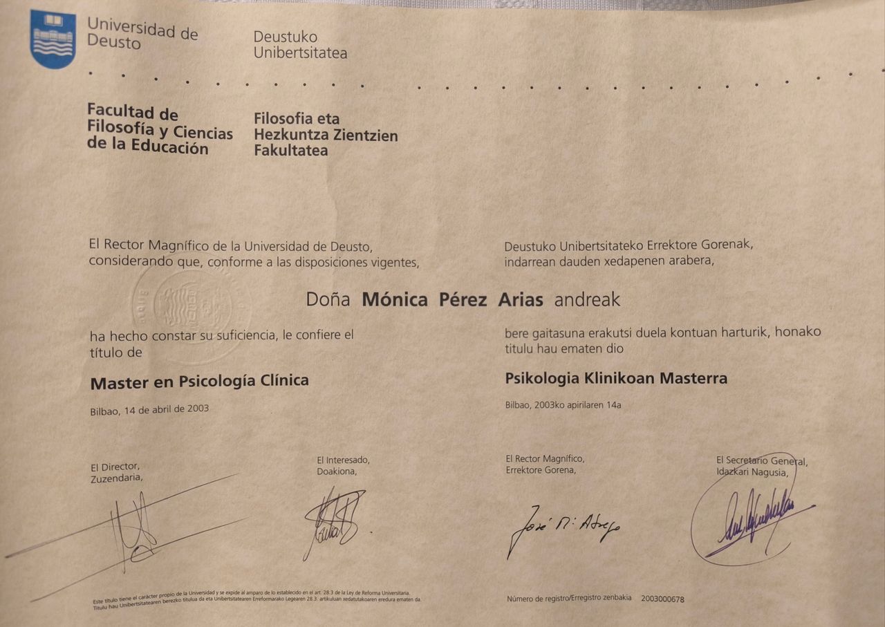 Soy Mónica Pérez Arias, psicóloga en Pamplona con más de 20 años de experiencia clínica acompañando a niños, adolescentes, adultos y parejas. Desde que inicié mi carrera tuve claro que quería dedicar mi vida a la psicología, y hoy puedo decir que es una de mis mayores pasiones y aciertos.