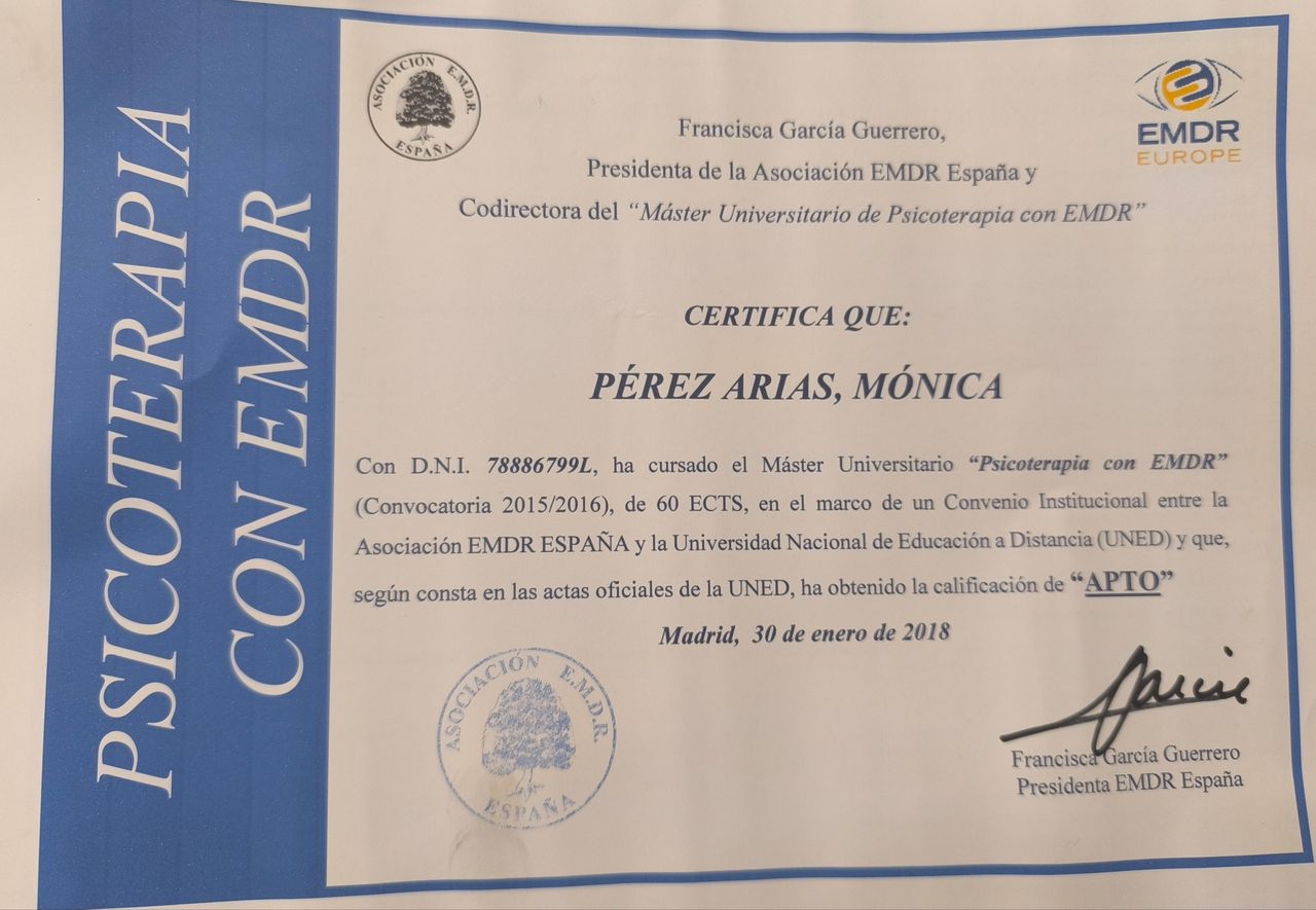 En consulta trabajo desde una mirada cercana, humana y científica. Utilizo diferentes enfoques, siendo mi especialidad la terapia EMDR, un abordaje de referencia internacional para el tratamiento de traumas, apego, ansiedad, fobias, bloqueos emocionales, duelos, relaciones de dependencia, estrés postraumático, TCA, TOC y dificultades emocionales. El EMDR lo integro con la terapia cognitivo-conductual y otros enfoques basados en la evidencia científica. Esto me permite ofrecer una psicoterapia eficaz y adaptada a las necesidades de cada persona.