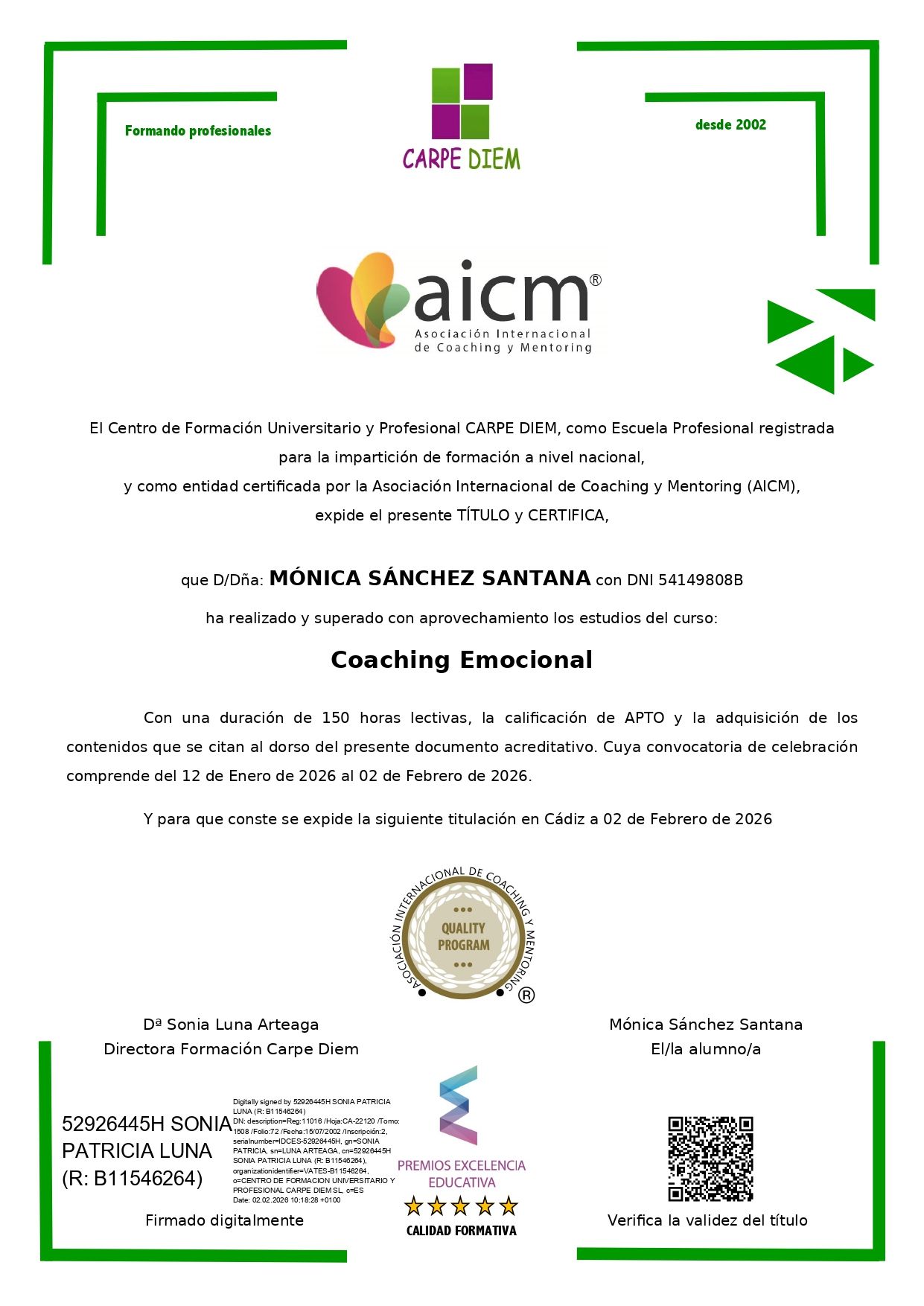 Estoy formada como Coach Emocional y certificada por la AICM (Asociación Internacional de Coaching y Mentoring), lo que me permite integrar herramientas de coaching emocional con una base en psicología, enfocadas en el bienestar y el autoconocimiento.