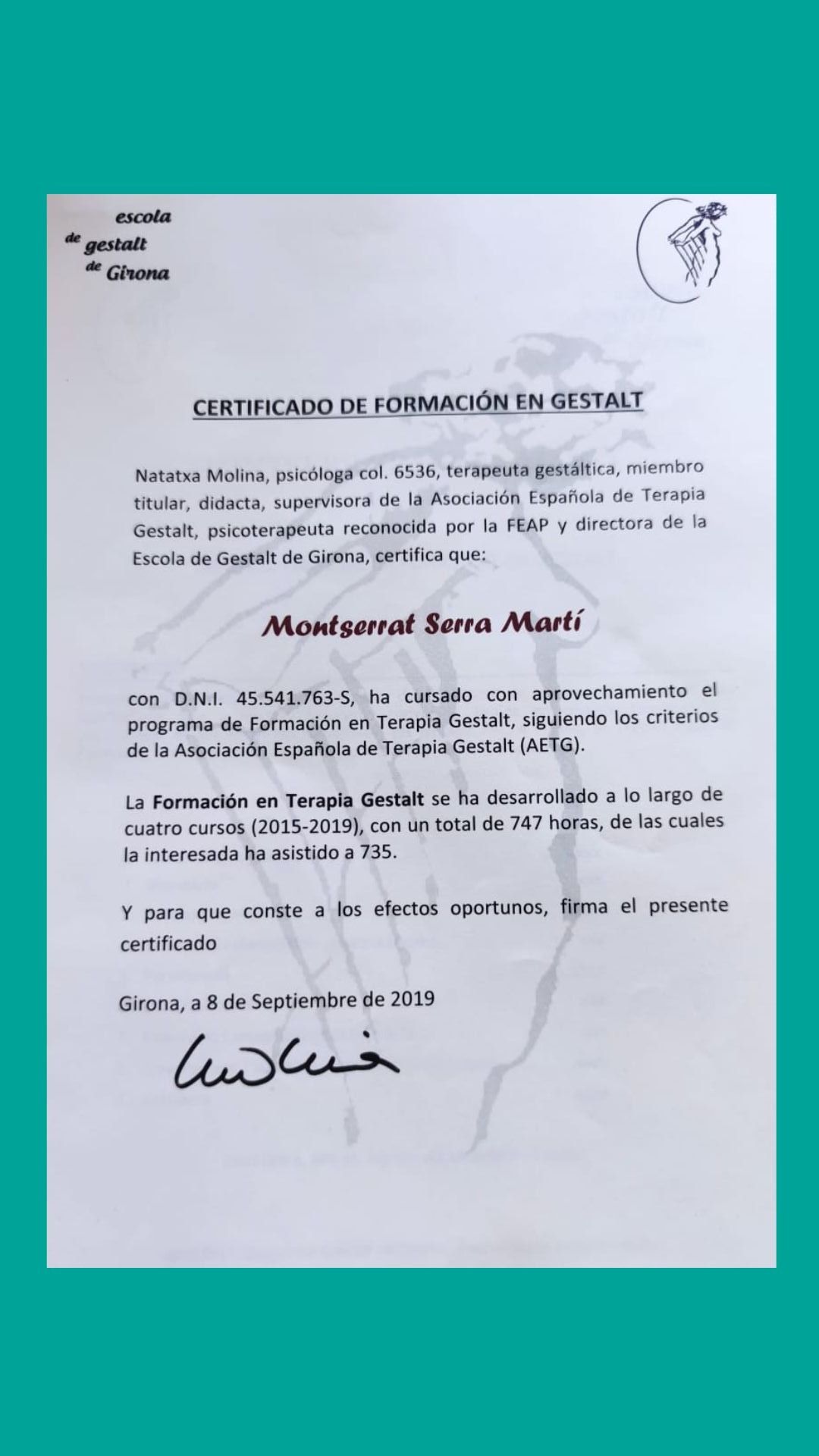 Porto gairebé 5 anys fent teràpia amb la Montse i estic molt contenta! Vaig arribar en un moment molt delicat i em va ajudar molt a sortir-ne. Ara seguim treballant coses i veure canvis dia a dia és increïble!