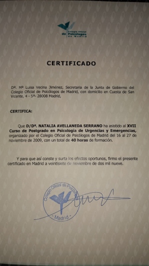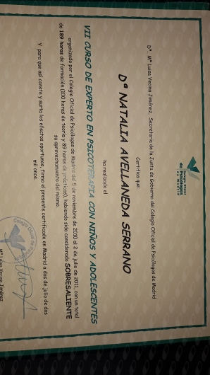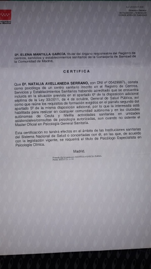 ¿Cuáles son las principales especialidades de Natalia Avellaneda Serrano?Natalia Avellaneda Serrano es psicóloga. Te mostramos algunos de los servicios que ofrece gracias a su trayectoria y amplia experiencia: Primera visita Psicología, Visitas sucesivas Psicología, Visita Psicología, Psicoterapia individual, Terapia cognitivo-conductual, Psicoterapia en adolescentes, Reestructuración cognitiva, Técnicas y estrategias de autoestima, Primera Visita Psicopedagogía, Visita Psicopedagogía.