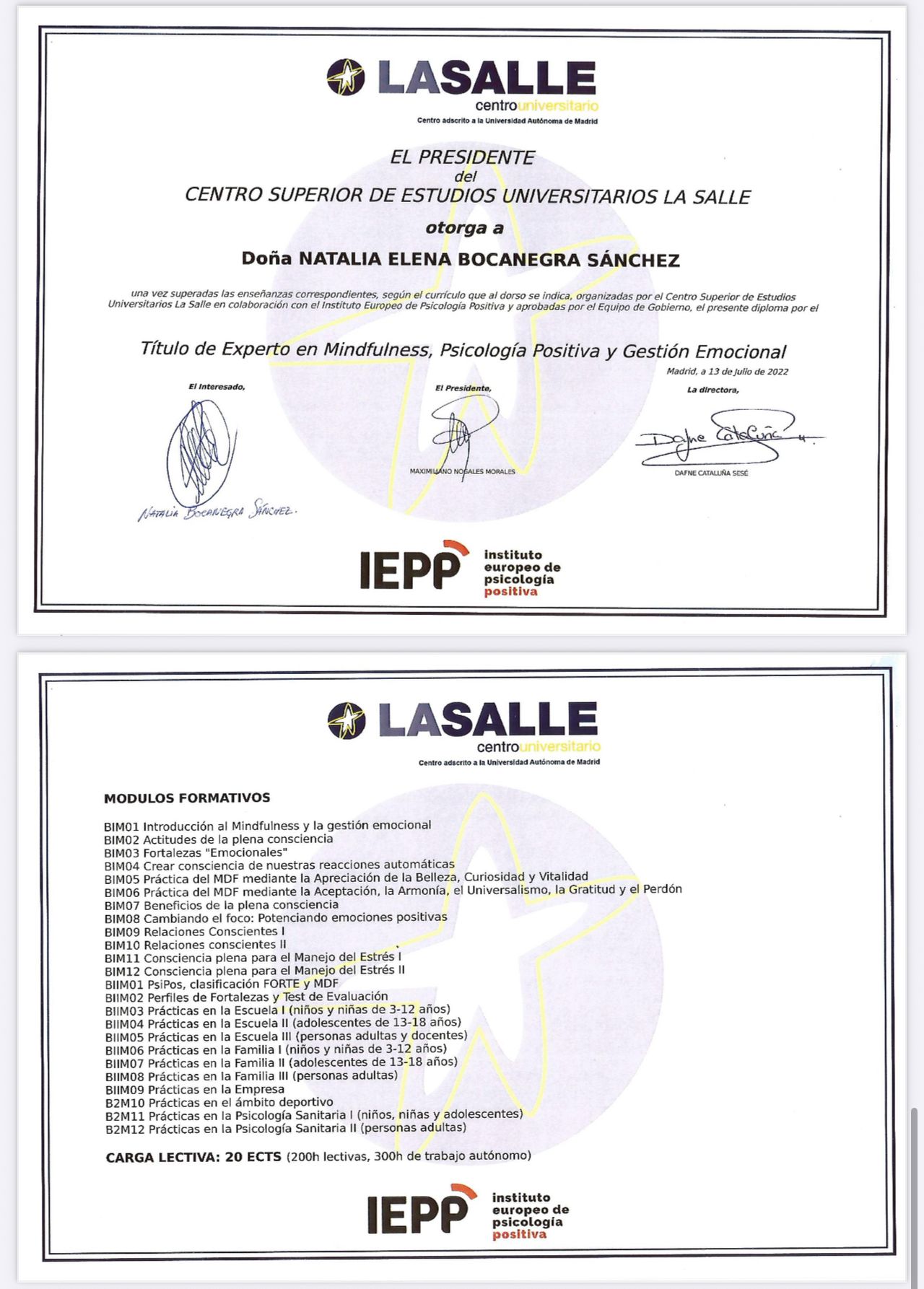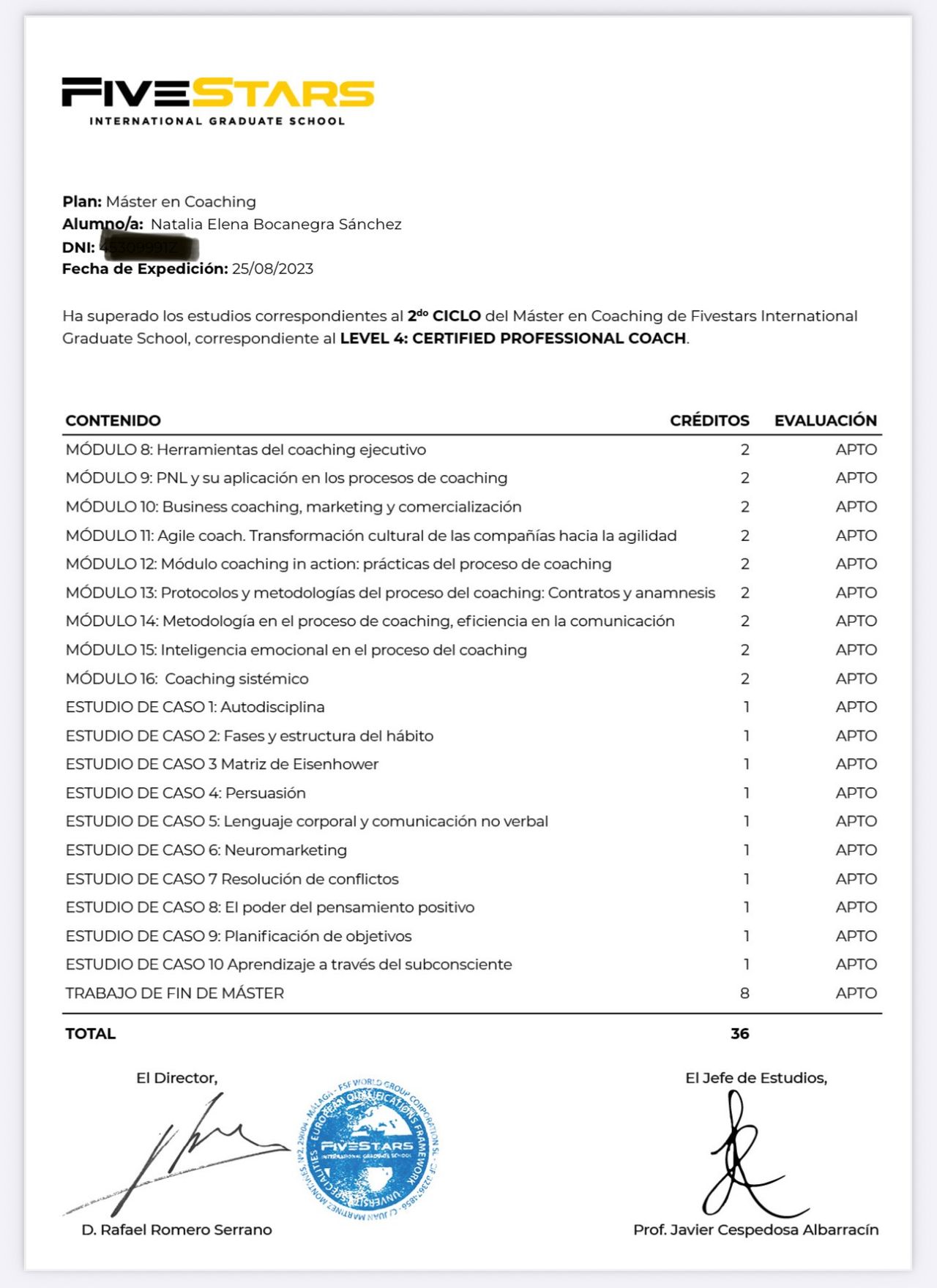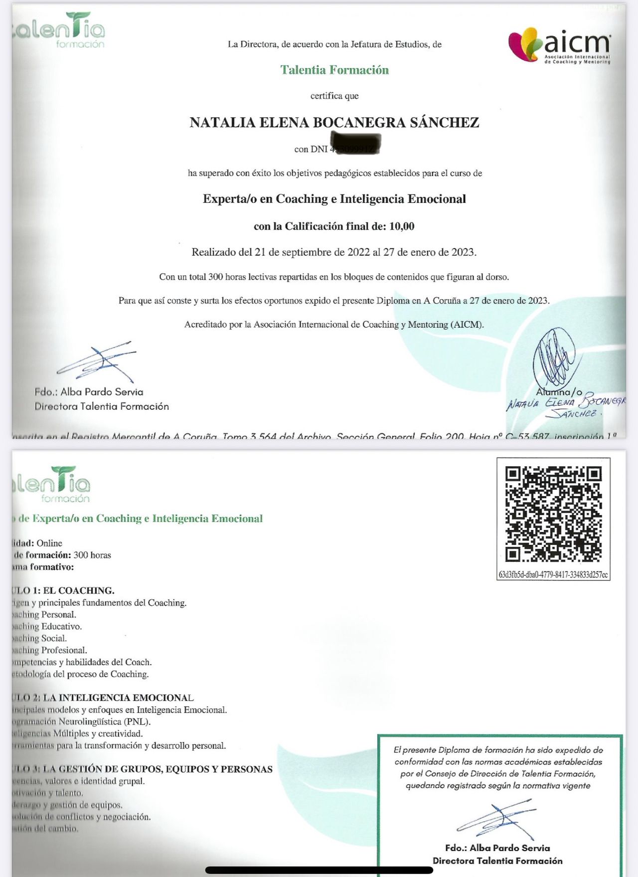 Cuento con una amplia formación en psicología positiva, Mindfulness, gestión emocional, inteligencia emocional, así como en coaching integrativo, personal y ejecutivo, lo que me permite ofrecer un acompañamiento profundo, estructurado y adaptado a las necesidades reales de cada persona.