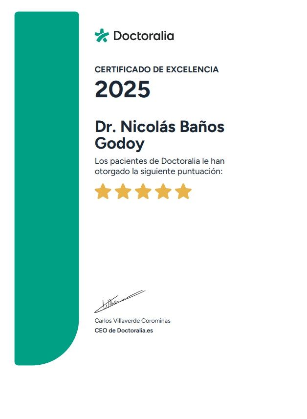 ¿Para cuándo podría visitarme con Nicolás Baños Godoy?A veces Nicolás Baños Godoy tiene algunas horas disponibles dentro de la misma semana o para la siguiente. Consulta su calendario: verás la primera hora que tiene disponible, ya que se actualiza en tiempo real. Si no te va bien esa primera hora, comprueba otros días. La reserva siempre es inmediata y gratuita.