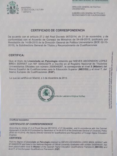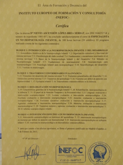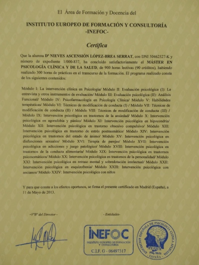 Soy Psicóloga Sanitaria, Máster en Psicología Clínica y de la Salud, Especialista en Neuropsicología Clínica Infanto-Juvenil, poseo Capacitación Docente en Neurociencias, Experta en Inteligencia Emocional y Social, Psicóloga de la Educación, Máster en IIMM aplicadas a la Educación, Experta en Mediación Escolar, Técnico en Violencia de Género, Psicóloga Industrial y Coach.