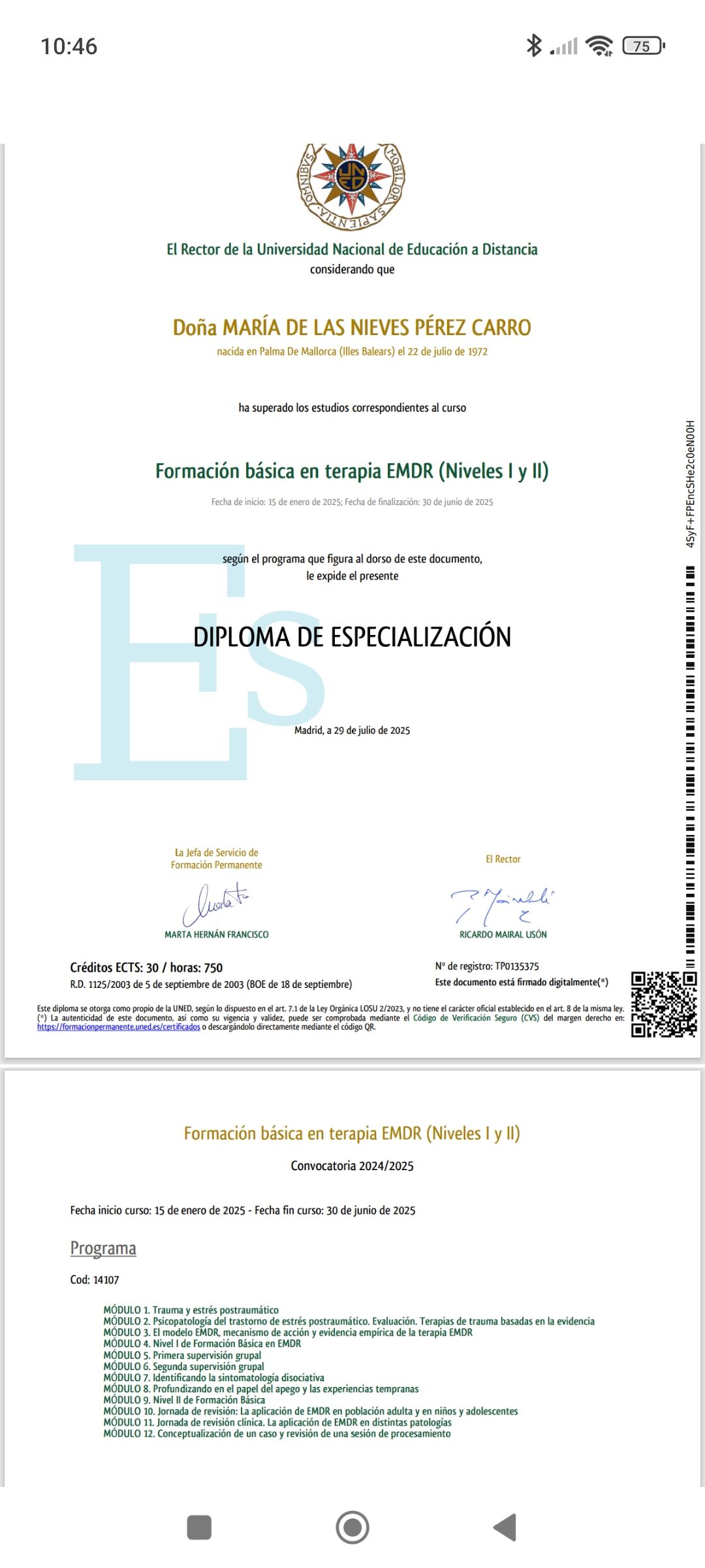 Solo tengo palabras de agradecimiento por el excelente trabajo realizado por Nieves conmigo, el cual mediante su experiencia y metodología en el trabajo con las adicciones (drogas) conseguí dejarlas después de realizar la terapia con ella. Destacar su trato cercano, confianza que te trasmite, empatía, metodología que aplica en el proceso y lo más importante el magnífico trato humano que te da. Gracias por tanto Nieves.