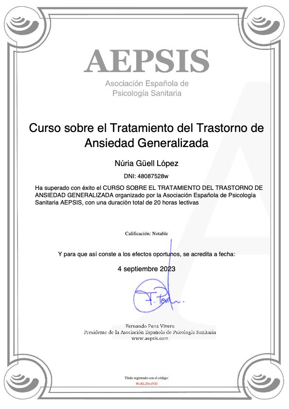 ¿Cuáles son las principales especialidades de Núria Güell?Núria Güell es psicóloga. Te mostramos algunos de los servicios que ofrece gracias a su trayectoria y amplia experiencia: Primera visita Psicología, Terapia online, Gestión de la ansiedad, Tratamiento de la ansiedad, Ataques de pánico y crisis de ansiedad, Terapia para la ansiedad generalizada, Tratamiento del estrés, Gestión del estrés laboral, Tratamiento de la depresión, Fobia social (ansiedad social).
