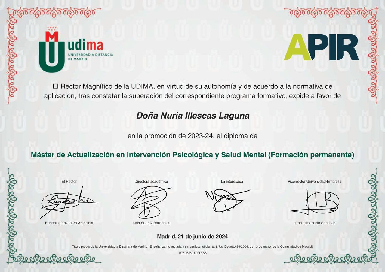 Me gradué en Psicología y Criminología en la Universidad Rey Juan Carlos y obtuve mi habilitación sanitaria a través de mi máster en la Universidad Europea de Madrid. No me gusta encajar mi terapia en un único enfoque, sino que empleo los requeridos en función de las necesidades y preferencias de cada caso particular, encuadrándome en un enfoque de psicoterapia integradora. Mi orientación principal es el uso de herramientas de terapia cognitivo-conductual integradas con la terapia sistémica.