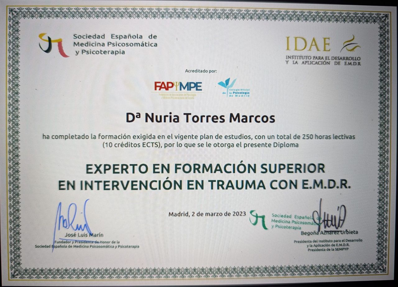 Nuria es una gran profesional. Gracias a ella he aprendido mucho sobre mi misma y estoy pudiendo superar una ruptura muy dura. Te hace entender las cosas, comprender, no he podido tener más suerte de que sea ella quien me esté ayudando en este proceso tan duro que estoy viviendo. Es cercana, empática, amable, cuidadosa y sobre todo sabe hacer muy bien su trabajo. Gracias Nuria.
