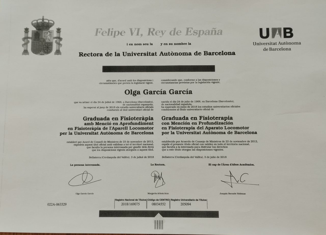 Me gradué en las Escuelas Universitarias Gimbernat en San Cugat Barcelona, en la especialidad de Aparato Locomotor y Suelo Pélvico. Fue la mejor decisión de mi vida en el ámbito profesional y la que más satisfacciones a nivel profesional me ha ofrecido.