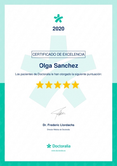 ¿Cómo puedo reservar una cita con Olga Sanchez?El calendario que muestra Olga Sanchez en Doctoralia está actualizado en tiempo real, por lo que solo tienes que elegir qué día y hora te va mejor de entre las disponibles. La reserva es gratuita, y además recibes un recordatorio antes de la visita.