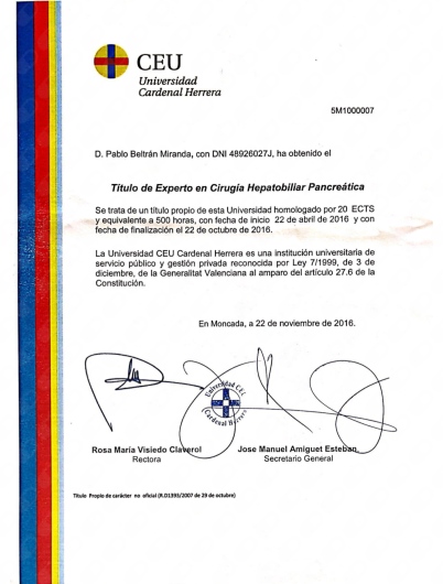 Tengo un título de Master en trasplante hepático por la Universidad de Sevilla y en Gestión Hospitalaria por la Universidad Alfonso X el Sabio y de Experto Universitario por la Universidad CEU Cardenal Herrera en cirugía HBP, esofagogástrica y cirugía de la obesidad mórbida.