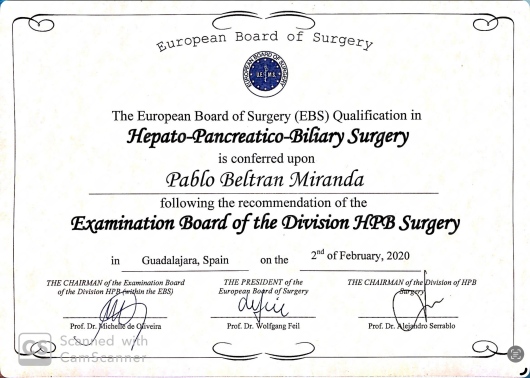 En 2020 obtuve la certificación europea (Board) en cirugía HBP (FEBS HPB) siendo el segundo cirujano andaluz en adquirir dicha certificación.