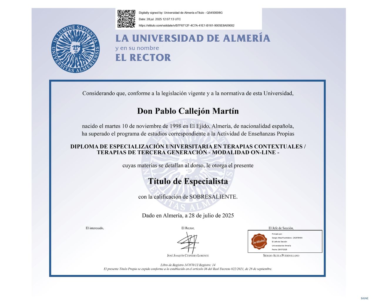 Mi nombre es Pablo Callejón Martín y soy Psicólogo General Sanitario con una sólida experiencia en el trabajo terapéutico, especialmente en las terapias de tercera generación como la Terapia de Aceptación y Compromiso (ACT) y la Terapia Analítico Funcional (FAP).