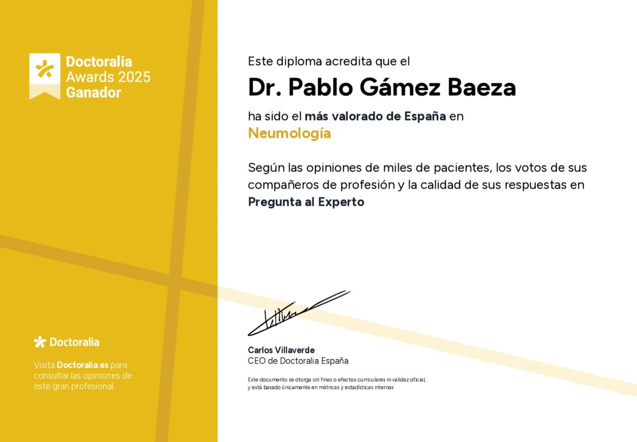 ¿Cuáles son las principales especialidades de Pablo Gámez Baeza?Pablo Gámez Baeza es neumólogo. Te mostramos algunos de los servicios que ofrece gracias a su trayectoria y amplia experiencia: Primera visita Neumología, Visitas sucesivas Neumología, Tratamiento para dejar de fumar, Fisioterapia respiratoria, Espirometría forzada, Espirometría (prueba de esfuerzo), Inmunoterapia parenteral, Pruebas epicutáneas con patch test, Pulsioximetría, Test de provocacion controlada de alto riesgo con medicamentos.