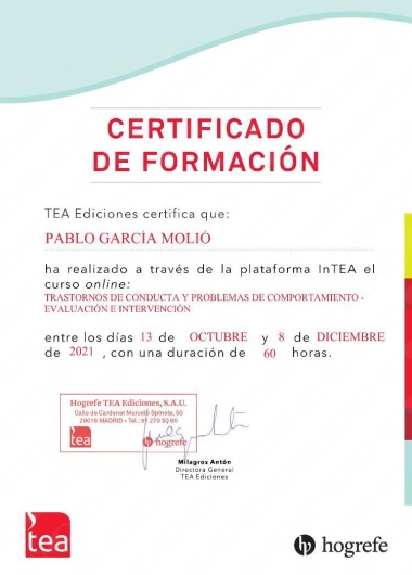 ¿Cuáles son las principales especialidades de Pablo García Molió?Pablo García Molió es psicólogo, psicólogo infantil. Te mostramos algunos de los servicios que ofrece gracias a su trayectoria y amplia experiencia: Orientación en la crianza de los hijos, Técnicas y estrategias de autoestima, Terapia individual, Visita domiciliaria Psicología, Estrategias terapéuticas en comunicación y habilidades sociales, Terapia familiar, Terapia de duelo, Psicoterapia infantil, Psicoterapia en adolescentes, Terapia online.