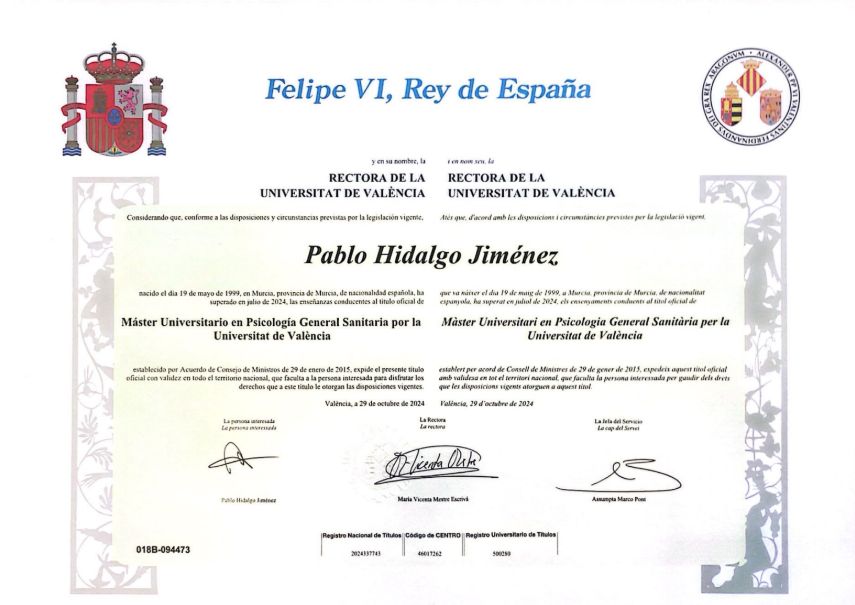 Me llamo Pablo Hidalgo Jiménez y soy tanto Psicólogo General Sanitario como Sexólogo Clínico. Estoy colegiado con el número CV-18841.