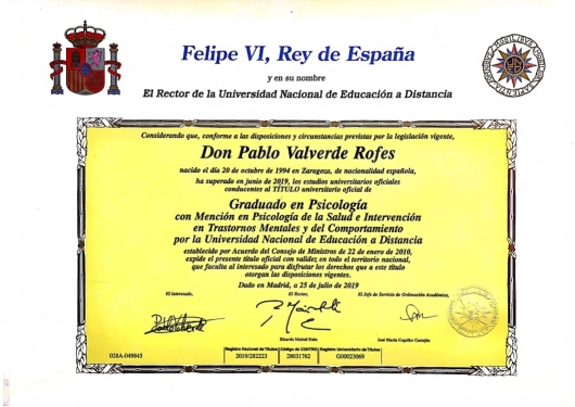 ¡Hola, bienvenido/a! Decidirse a buscar ayuda profesional no es nada fácil, a veces cuesta comprender las cosas que nos pasan. Aquí encontrarás un sitio seguro, de paz, de confianza, y trabajaremos para descubrirlo y hallar una solución a esas dificultades. Siempre desde la calidez y la empatía en este camino que andaremos, sin juicios. Me llamo Pablo, y llevo años ayudando a las personas a encontrar ese bienestar emocional que todos necesitamos y que a veces parece lejano o difícil de obtener. Sin embargo, es posible conseguirlo, hay un camino a seguir y si decides confiar, lo averiguaremos. ¡Nos vemos pronto! Grado en Psicología. Máster en Psicología General Sanitaria. Máster en Terapia Infanto - Juvenil. Máster en Orientación Educativa. Formación en Psicoterapia Psicoanalítica, (AAPIPNA) Colegiado por el Colegio Oficial de Psicólogos de Aragón, COPPA (A-03777).