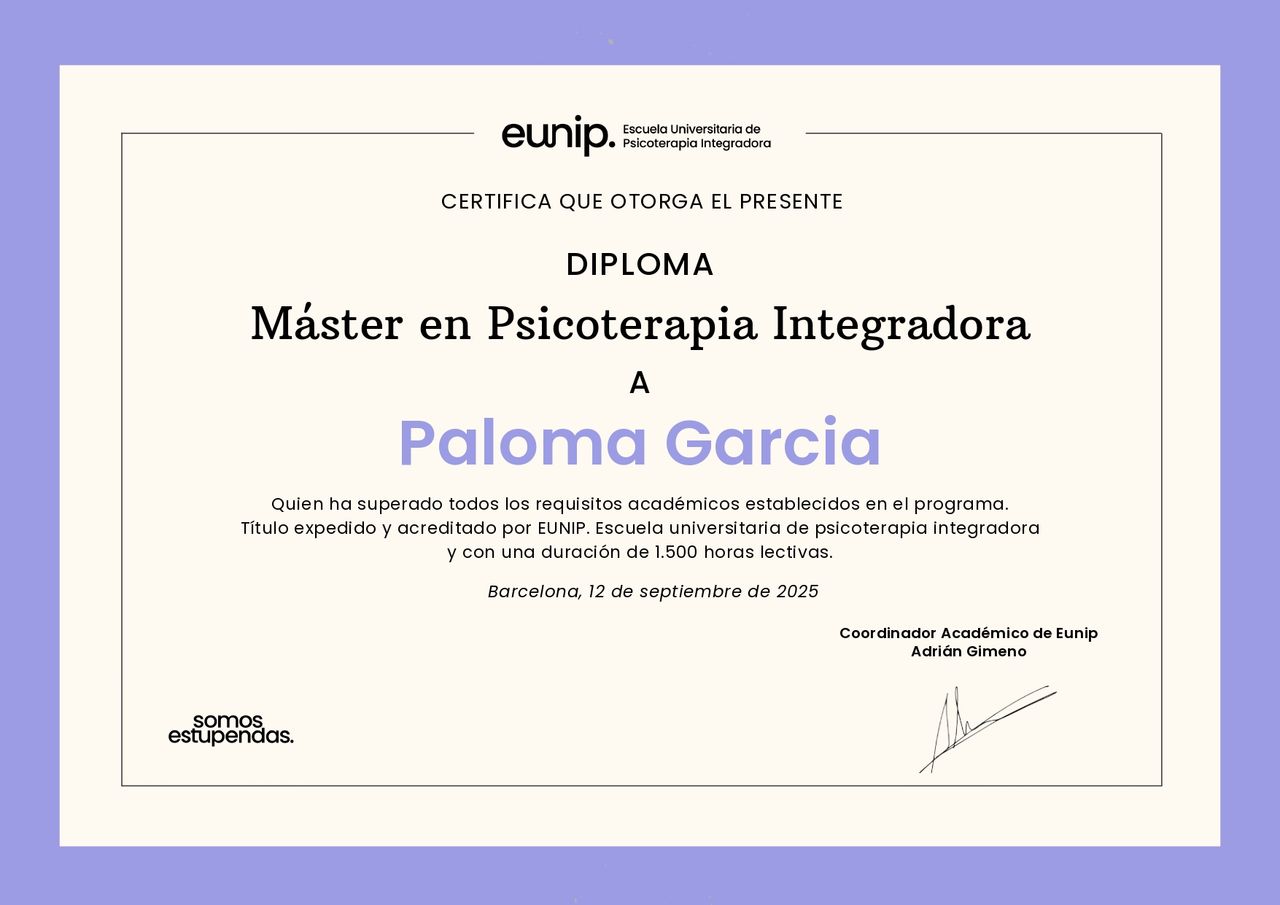 Desde el primer momento me sentí muy cómoda y sobre todo comprendida con Paloma, lo que me ayuda a abrirme y desahogarme en total confianza, sin duda me parece una profesional excelente, y recomiendo sus servicios al 100%!
