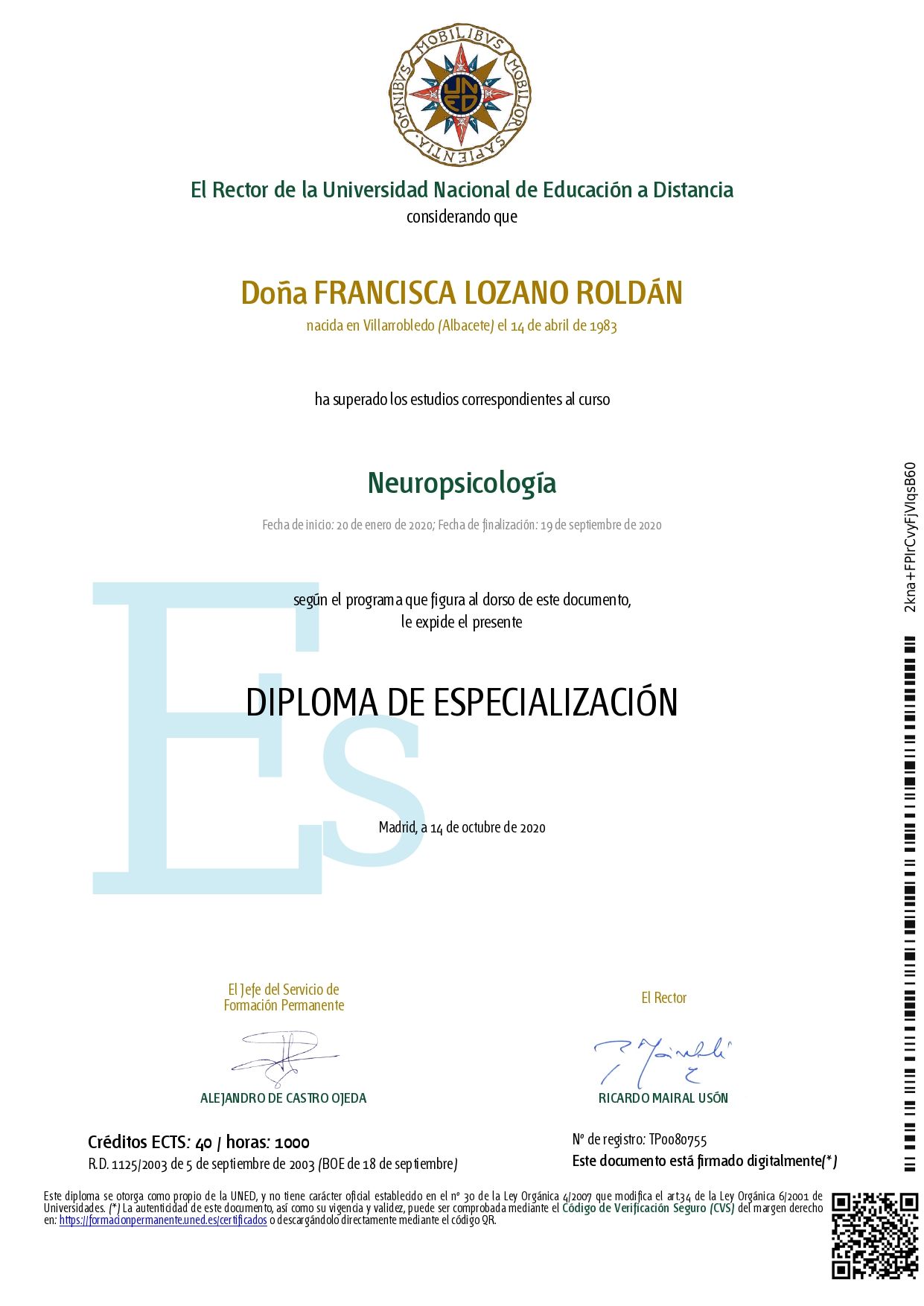 Especialista en Neuropsicología.