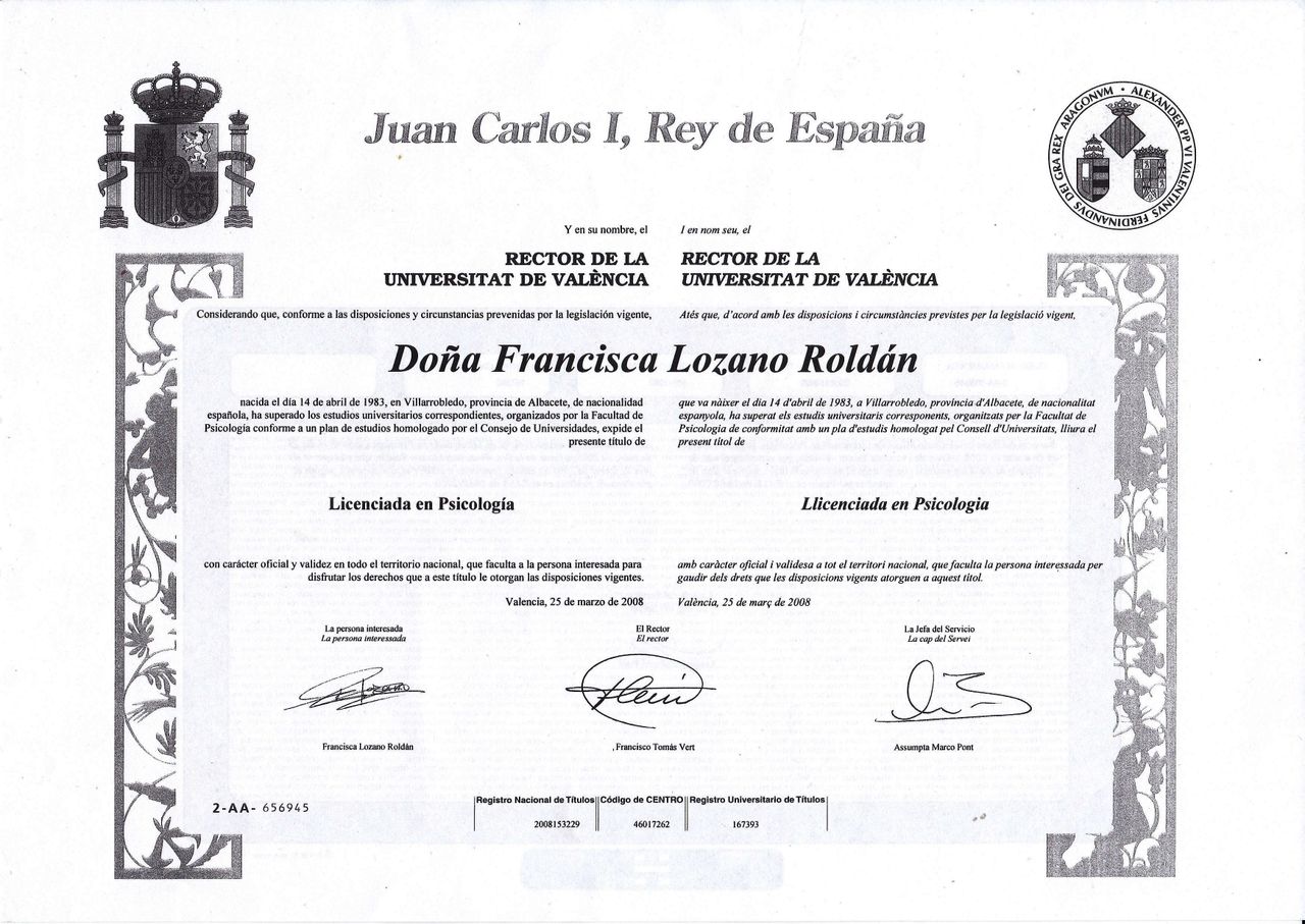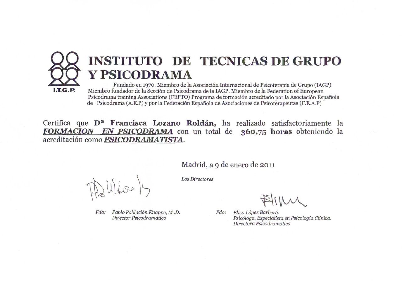 ¿Cuáles son las principales especialidades de Paqui Lozano Roldán?Paqui Lozano Roldán es psicóloga. Te mostramos algunos de los servicios que ofrece gracias a su trayectoria y amplia experiencia: Primera visita Psicología, Visitas sucesivas Psicología, Primera visita Psicología Infantil, Visitas sucesivas Psicología Infantil, Primera visita terapia de pareja, Visitas sucesivas terapia de pareja, Consulta sucesiva terapia familiar, Mindfulness, Primera visita terapia familiar, Psicodrama terapéutico.