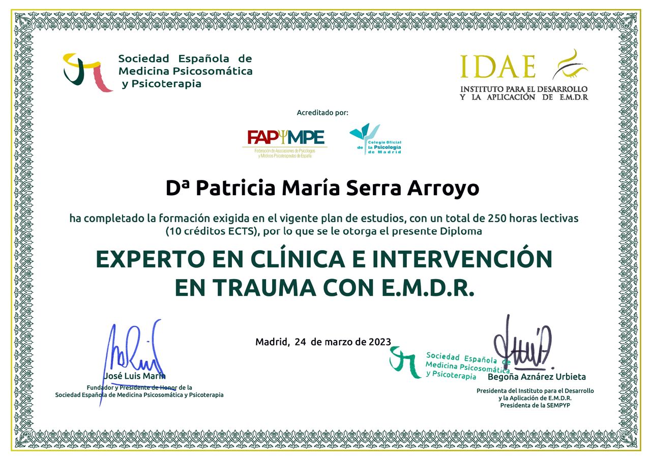 Hipnosis,EMDR,psicoterapia integradora,evaluaciónTrauma, trastornos de personalidad, apegoAnsiedad, depresión, autoestima