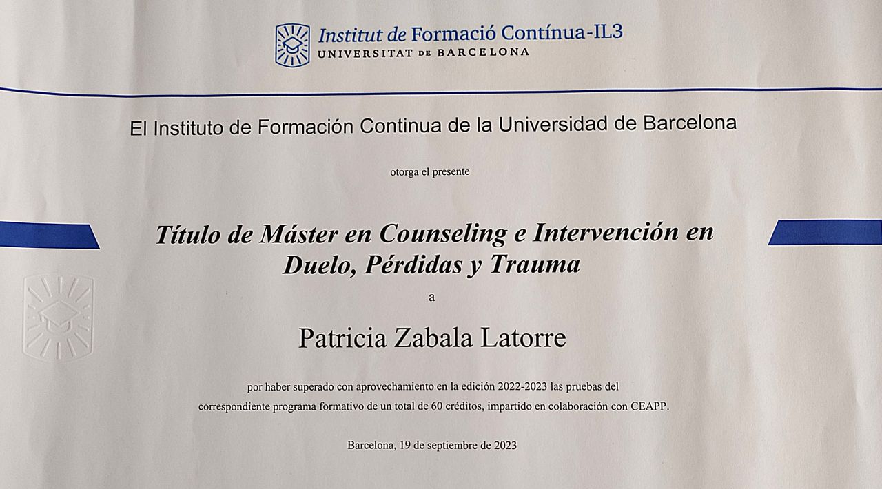 Al finalizar la licenciatura cursé el Máster Internacional en Psicología Clínica nivel I y II en el Centro de Terapia de Conducta Valencia (reconocido por el Colegio Oficial de Psicólogos con carácter científico-profesional), que me proporcionó formación a nivel teórico y práctico (siguiendo la orientación Cognitivo Conductual) y del que aprendí muchísimas cosas, tanto a nivel profesional como personal.