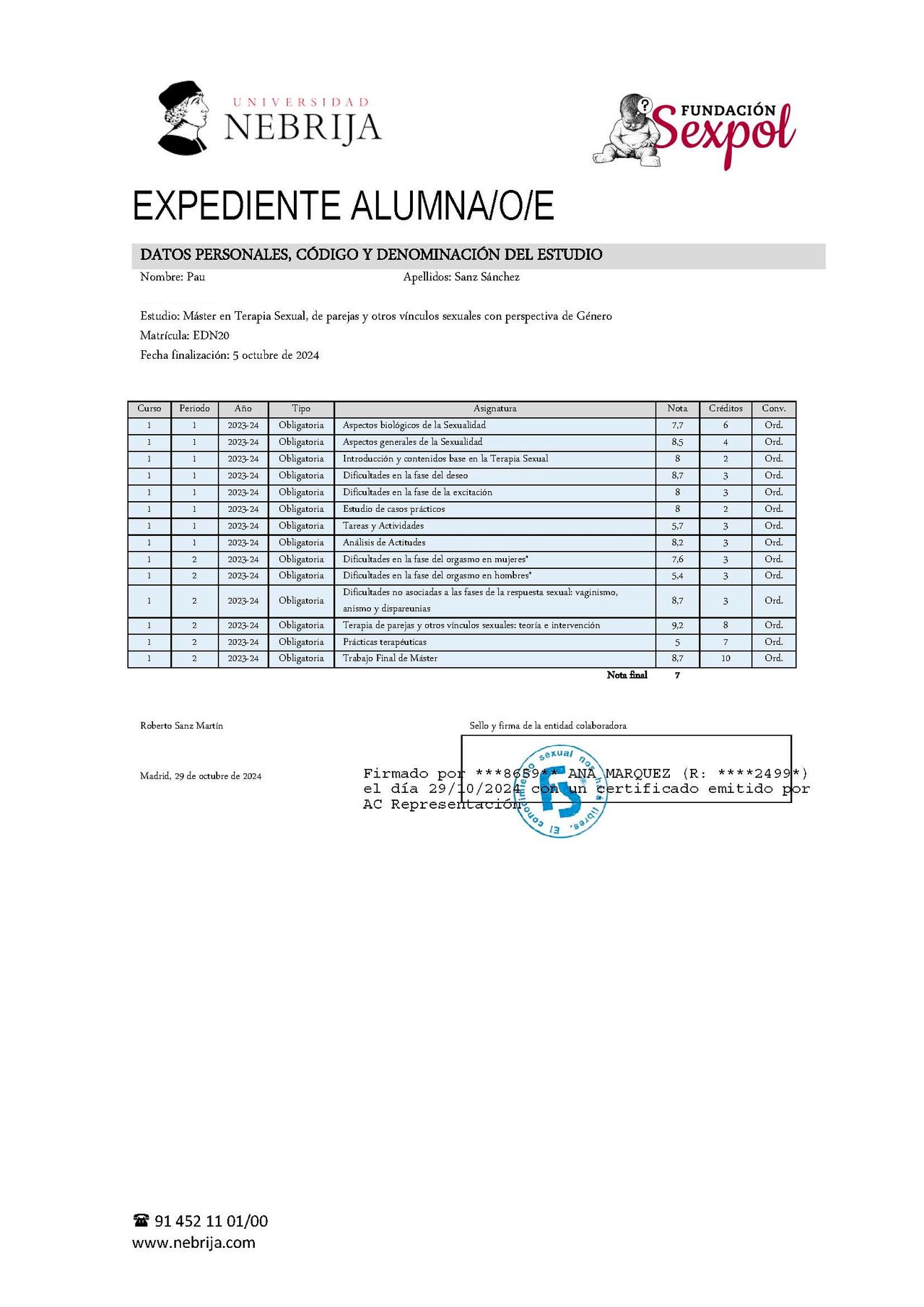 Realicé mi carrera de Fisioterapia en la Universidad San Rafael Nebrija en Madrid, y antes de terminar mis prácticas ya estaba trabajando en la unidad de suelo pélvico de las Clínicas Rozalén. A los meses realicé el Experto Sanitario en Suelo Pélvico con Laura Calzado y a los meses realicé el Máster universitario en Terapia sexual y de pareja con perspectiva de género de la Fundación Sexpol en Madrid.