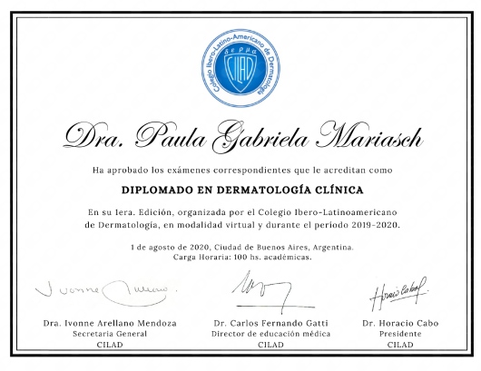 ¿Cuáles son las principales especialidades de Paula Gabriela Mariasch?Paula Gabriela Mariasch es médica general, médica estética. Te mostramos algunos de los servicios que ofrece gracias a su trayectoria y amplia experiencia: Visita Medicina General, Consulta médica, Consulta online, Visita Medicina Estética y Cirugía Cosmética, Consulta de valoración médica marcas de acné, Terapia Fotodinamica de Acne, Cicatrices de acné, Cuidados acné, hiperpigmentación, melasma, IPL (Luz Pulsada Intensa) para fotorrejuvenecimiento, IPL Lentigos.