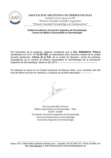 Directora del Área Asistencial Clínica de la Piel para la carrera de Médicos Especialistas en Dermatología (Asociación Argentina de Dermatología).